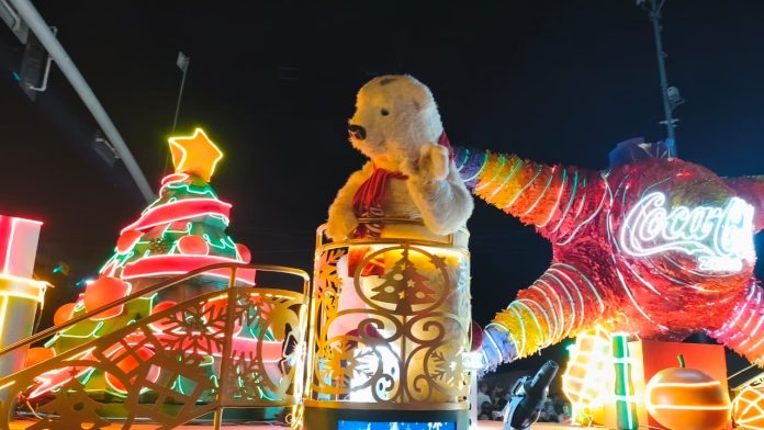 A las 19:00 horas, la oscuridad de la noche se rasgó con un estallido de música y luz. La Caravana Coca-Cola comenzó el desfile los gigantescos inflables que robaron suspiros, desde la Coca-Cola monumental y el entrañable Oso Polar, figuras que marcaron el inicio oficial de la temporada navideña.