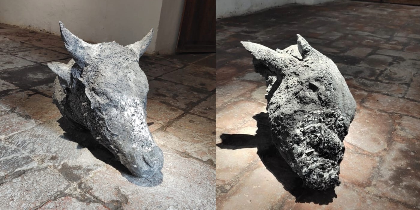 Las bolas hechas de plástico doméstico reciclado y prensado en pieles de animales domésticos, los latones y las fundiciones grises a carne perdida de cráneos de cabras y vacas son objetos que enfrentan al público a lo orgánico, cuya vida ha sido eliminada.