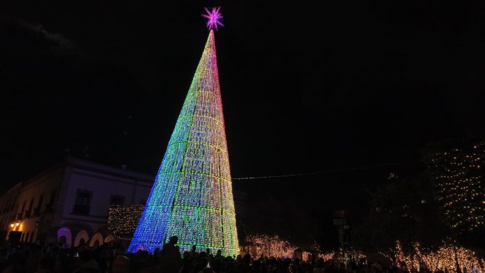 Querétaro, Qro., 3 de diciembre de 2025.- Querétaro dio inicio a sus festejos decembrinos con una emotiva ceremonia que tiñó de luz y espíritu navideño el corazón de la ciudad. La capital se iluminó con el tradicional Árbol Navideño en la Plaza de Armas, marcando el comienzo de una temporada que busca unir a familias y visitantes.