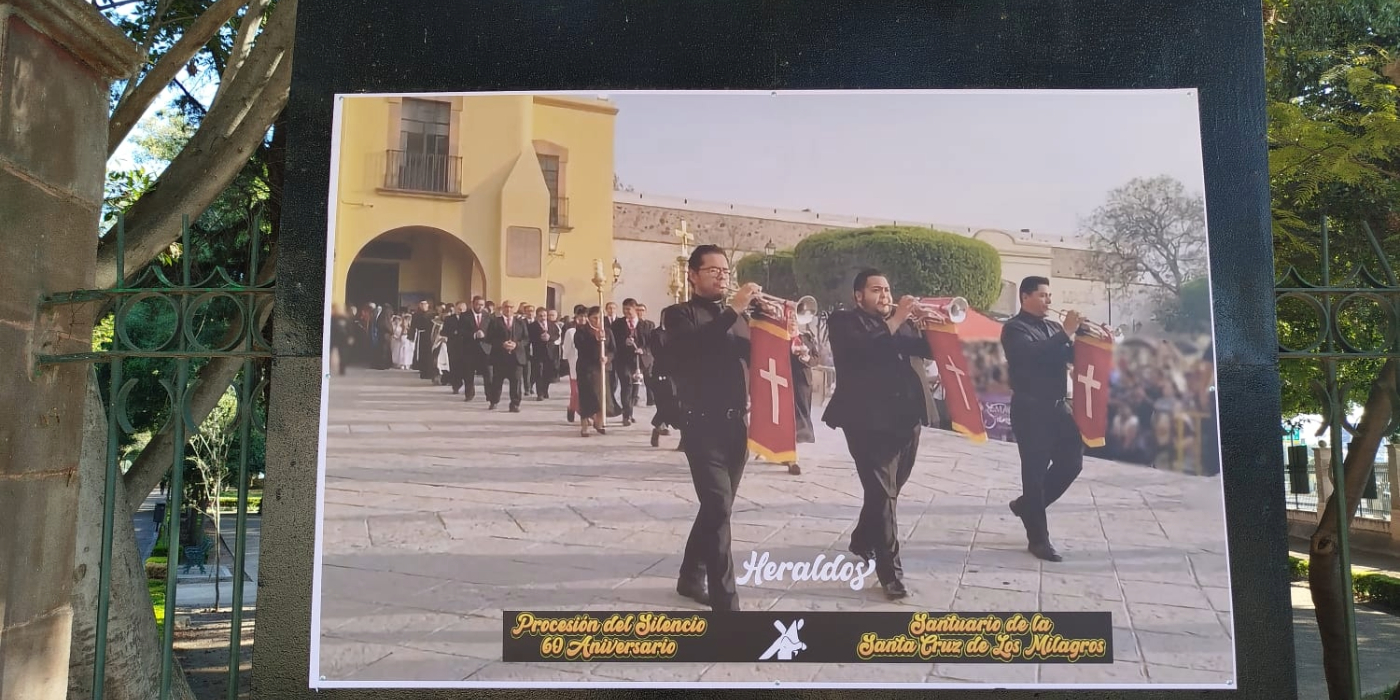 Querétaro, Qro., 18 de enero de 2026.- Con motivo de su LX aniversario, la Procesión del Silencio del Santuario de la Santísima Cruz de los Milagros es objeto de un homenaje fotográfico en el perímetro de la Alameda Hidalgo. Esta tradición, que nació el Viernes Santo de 1966 bajo la guía del sacerdote franciscano Fray Ernesto Espitia, cumple seis décadas de presencia casi ininterrumpida en la ciudad.
