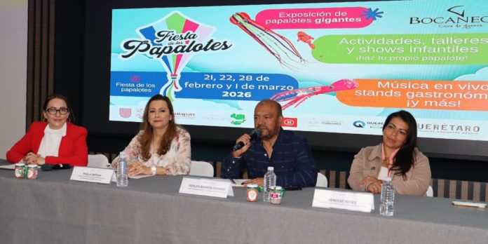 Querétaro, Qro., 16 de febrero de 2026.- La líder de Proyectos de Promoción Turística de la Secretaría de Turismo del estado, Paola Ortega Muñoz, anunció junto a organizadores, la nueva edición del Festival del Papalote en Tequisquiapan, un evento recreativo y cultural que reunirá a familias, niñas, niños, jóvenes, emprendedores y visitantes en un entorno al aire libre.