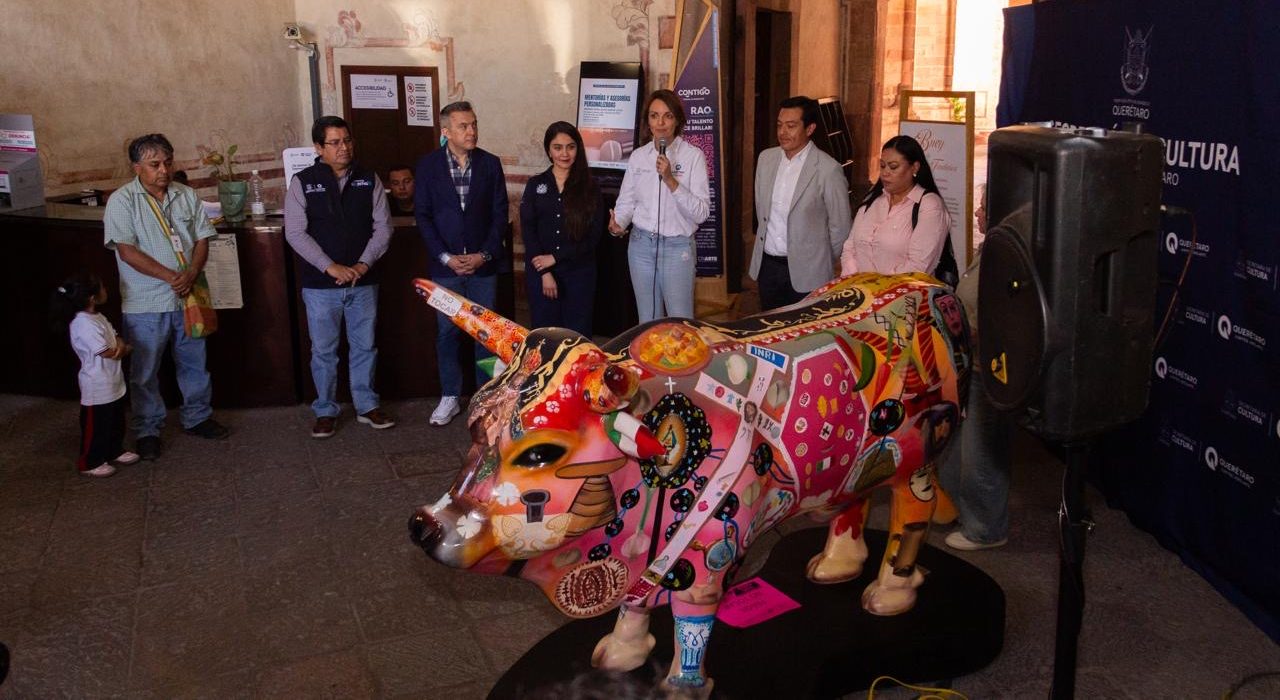La titular de la SECULT explicó que la muestra artística consta de 12 piezas escultóricas de bueyes elaborados en fibra de vidrio, las cuales fueron intervenidas de manera individual por los autores bajo la temática “Corregidora: mi inspiración”, quienes plasmaron en cada obra su visión, su historia y su amor por su tierra.