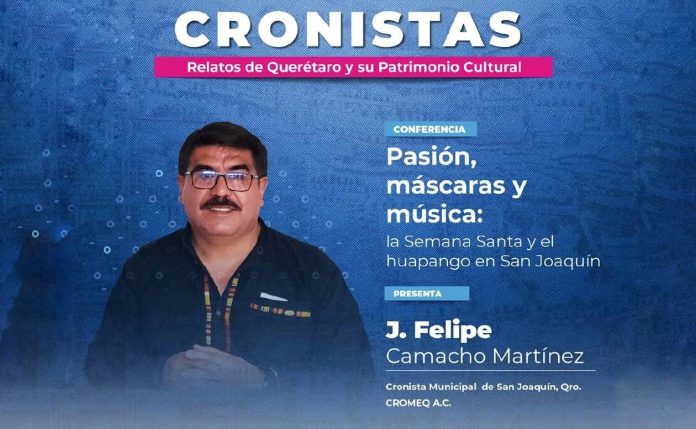 Querétaro, Qro., 5 de abril de 2026. A través de la Coordinación de Patrimonio Inmaterial y Fiestas Comunitarias, se invita a la ponencia titulada “Pasión, máscaras y música: la Semana Santa y el huapango en San Joaquín”. Este evento forma parte del ciclo “Cronistas: Relatos de Querétaro y su Patrimonio Cultural”, un espacio dedicado a la divulgación de las crónicas locales y la identidad serrana.