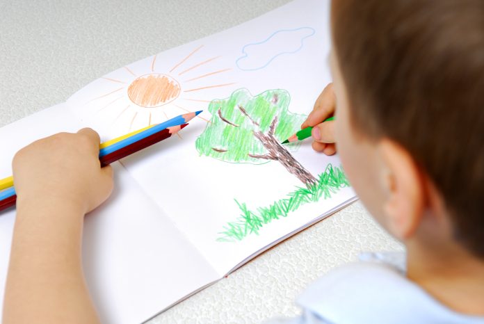 Preschooler drawing using the multicolored pencils